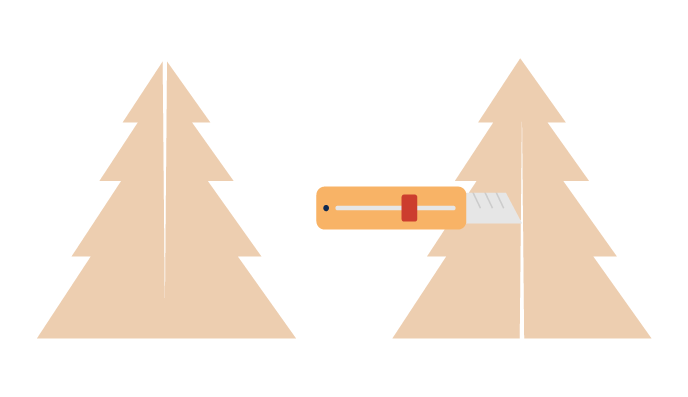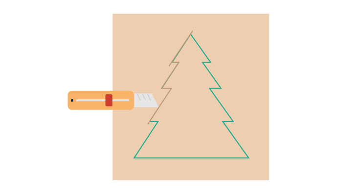 はさみ、ナイフ、定規を使ってツリーの形に段ボールをカットしていきます。細かく切りたい場合は、正確に切れる精度の高いツールを使ってください。