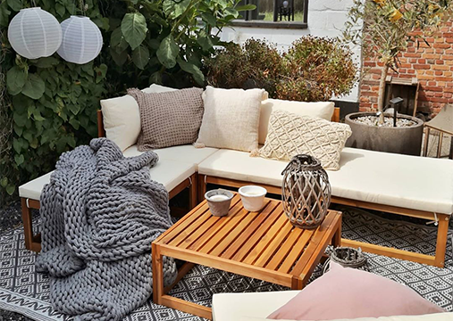 お庭で色と輝きと平和を融合させましょう。鮮やかなラグ、手触りのよいクッション、きらめくライトをぜひご覧ください!
